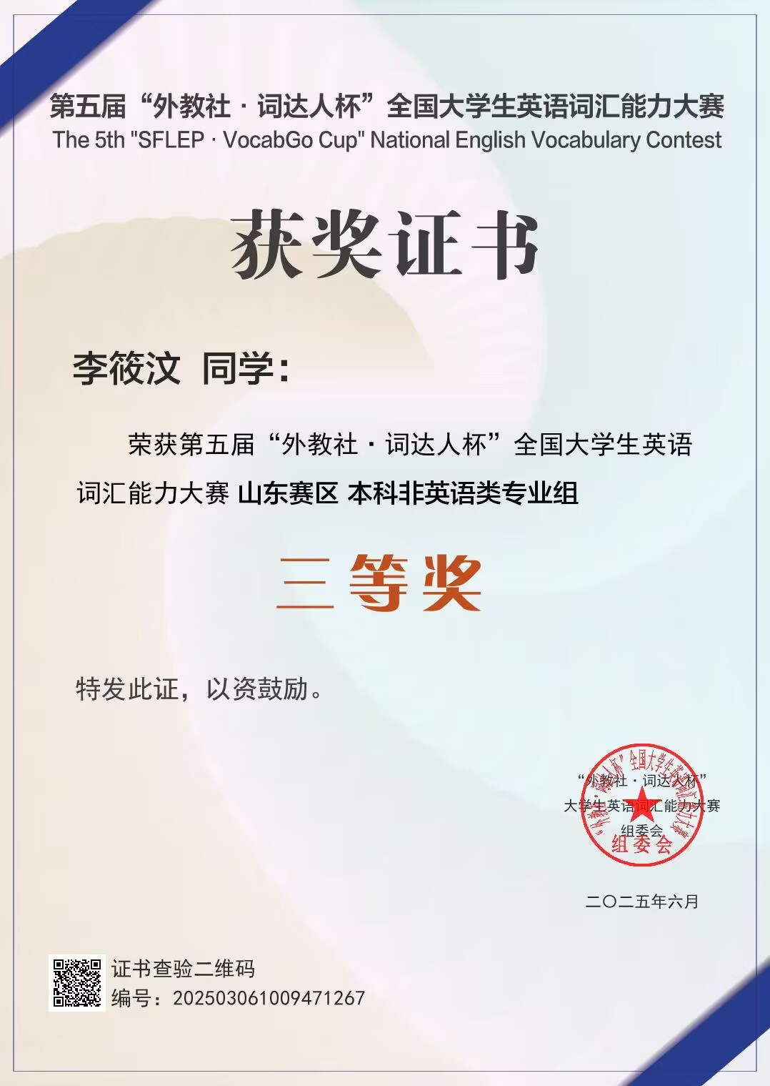 为鼓励学生提高外语应用能力,更好的培养国际化人才,awc777万象城娱乐官网于近期组织学生参加了第五届“外教社·词达人杯”全国大学生英语词汇能力大赛,经过学校组织的两轮比赛,学院共有15名同学入围省赛,最终材料226班李筱汶同学获得山东赛区三等奖。